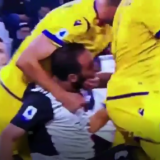 incravattato da Rhamadani (il motivo come costui abbia finito la partita senza essere espulso è un mistero…) con il compagno di merende Di Carmine che lo travolge (La fuoriuscita del sangue dal naso lo procura quest’ultimo).