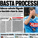 Oggi De Paola su Tuttosport propone di mandare al diavolo i regolamenti e non punire Higuain per l'aggressione a Irrati, in nome della legge dello spettacolo: the show must go on. Per la Juve non cambierebbe nulla: i bianconeri dovranno pensare solo a vincere le proprie partite, visto il distacco consistente sui partenopei. Per cui, per quieto vivere, si può anche dire:...
